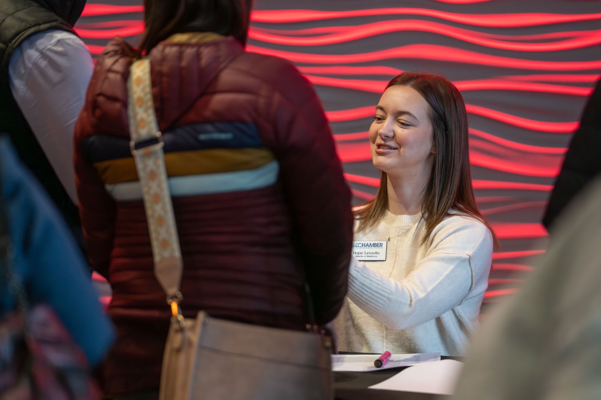 Hope Turvaville talking with a student at a January 2026 Chamber event hosted in Davies Center.